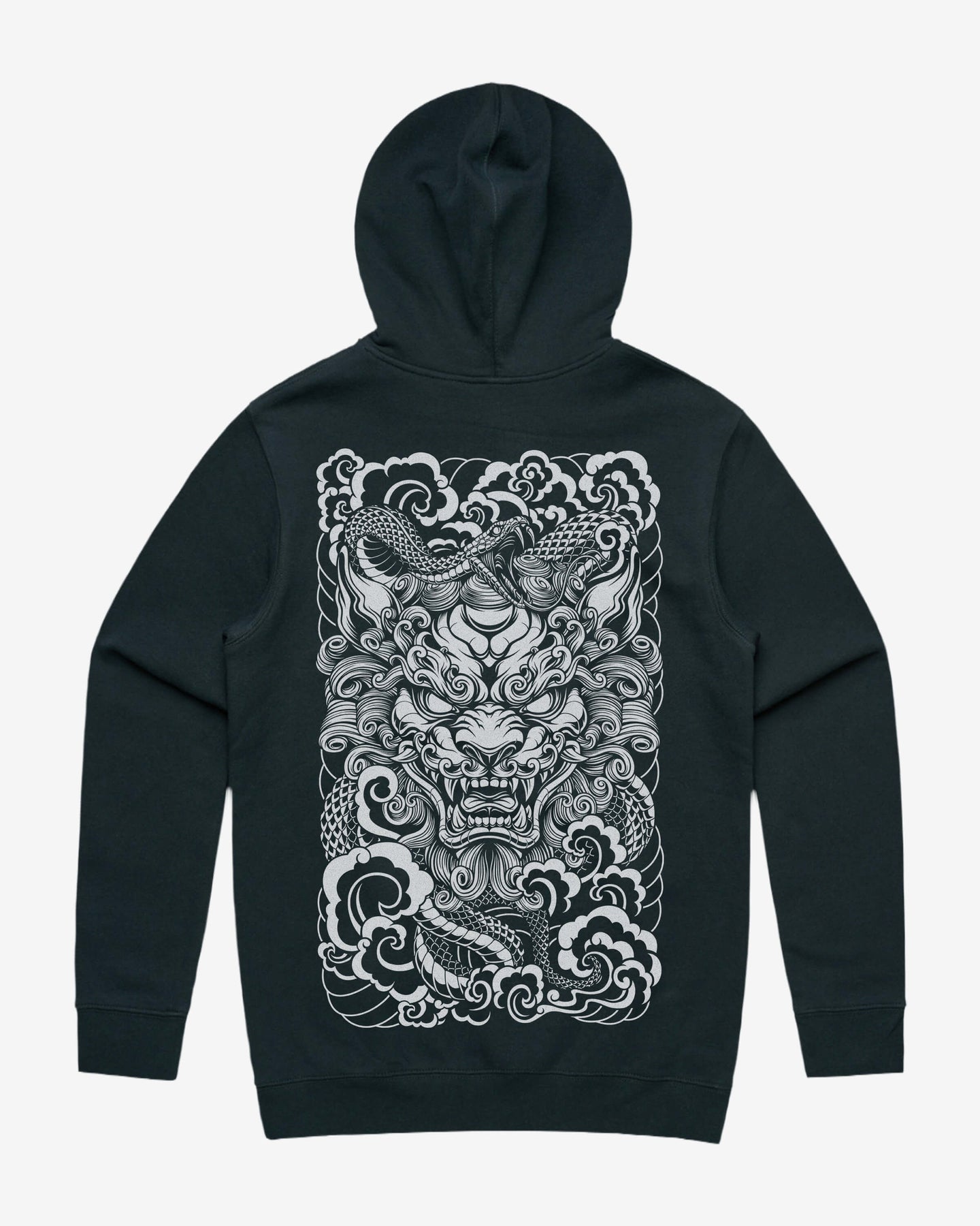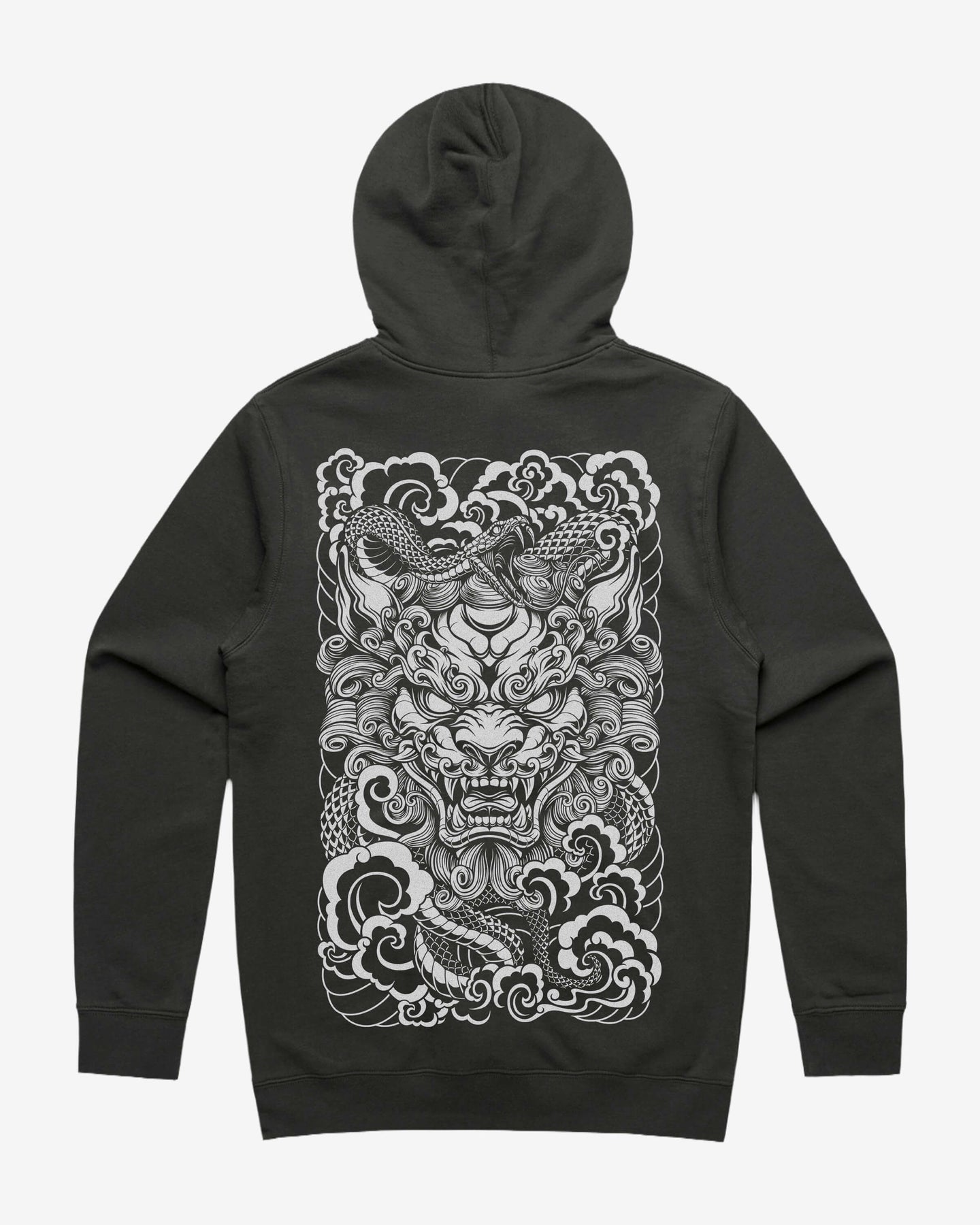 Heavyweight hoodie featuring a fierce Komainu head emerging through swirling clouds, tightly coiled by a serpent in classic Neo-Japanese Irezumi style. Printed large across the back of this hoodie, the artwork delivers heavy symmetry, layered linework, and bold Gakubori-inspired detailing.