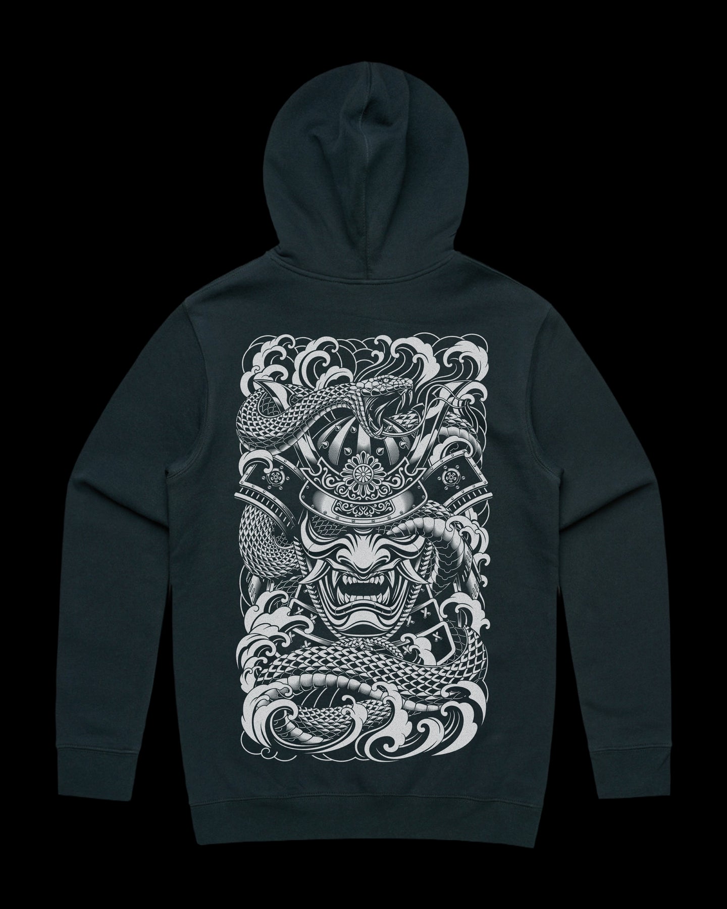 A menacing samurai mask is entwined by a coiled serpent, its body threading through one eye socket in bold Neo-Japanese Irezumi style. Printed large across the back of this hoodie, the artwork delivers intense contrast, sharp detailing, and layered Gakubori-inspired linework. The fusion of warrior spirit and serpent symbolism creates a raw, powerful presence — a statement piece rooted in traditional tattoo energy and modern streetwear attitude.