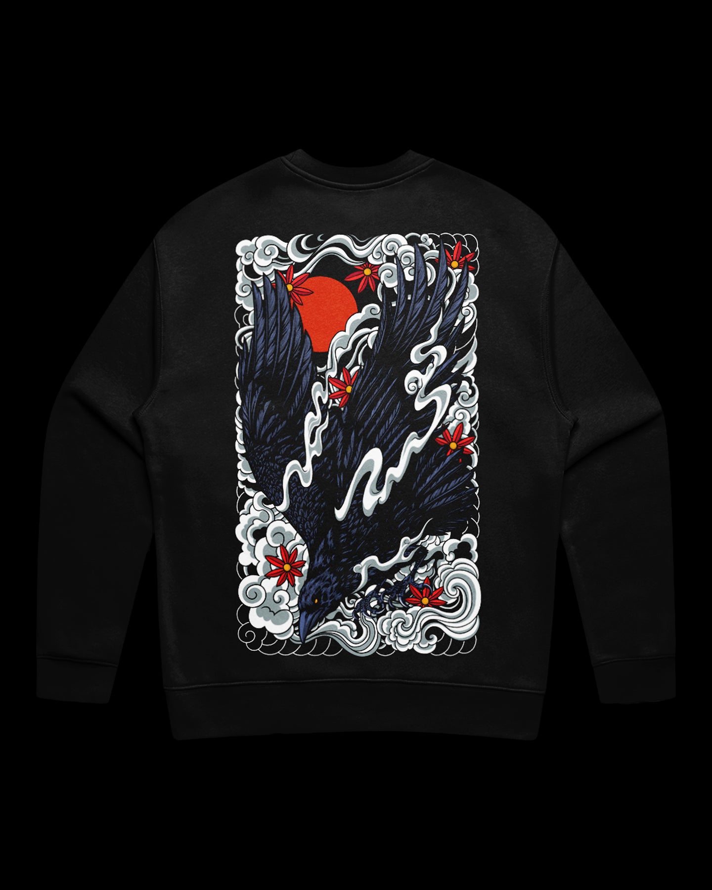 Black sweatshirt with a irezumi inspired raven design print on the back.