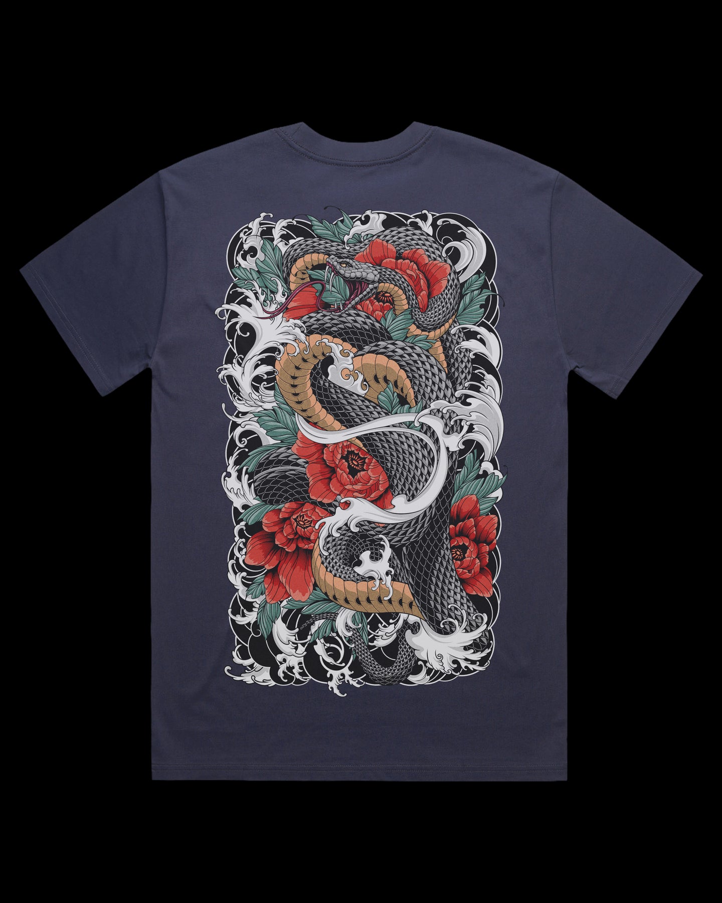 Featuring a powerful coiled snake wrapped around bold crimson blossoms, this design is framed by swirling Irezumi-inspired clouds and rooted in traditional Wabori and Gakubori tattoo art. The serpent symbolizes rebirth, protection, and calculated strength — reinterpreted through bold Neo Japanese streetwear aesthetics.